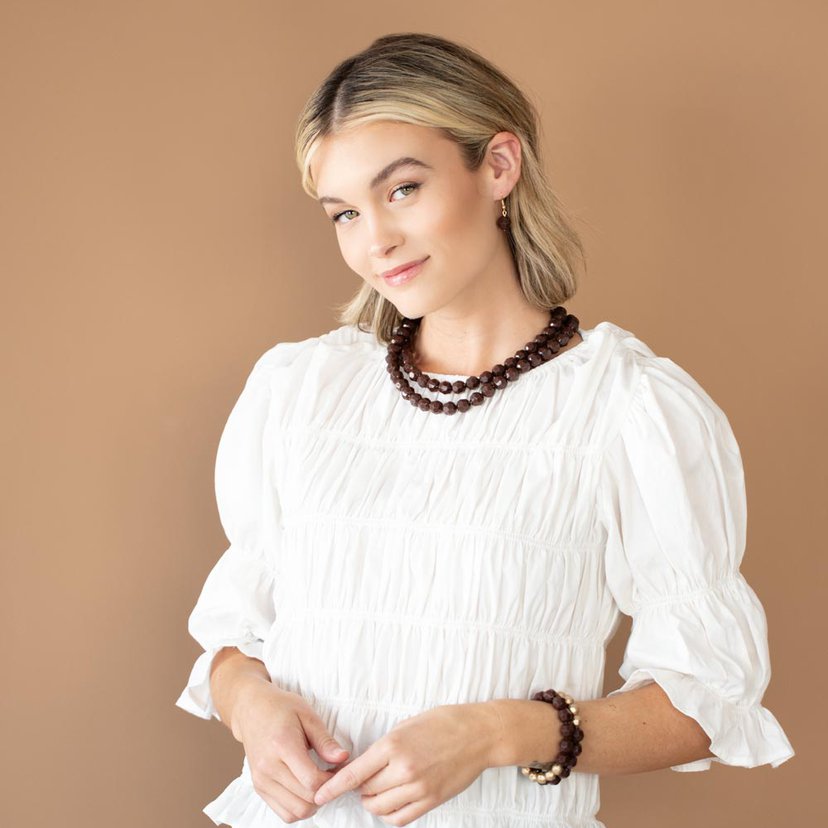 Faceted Coca Mocha and golden acrylic beads are threaded along invisible wires below the collar, creating a modern pop of color.