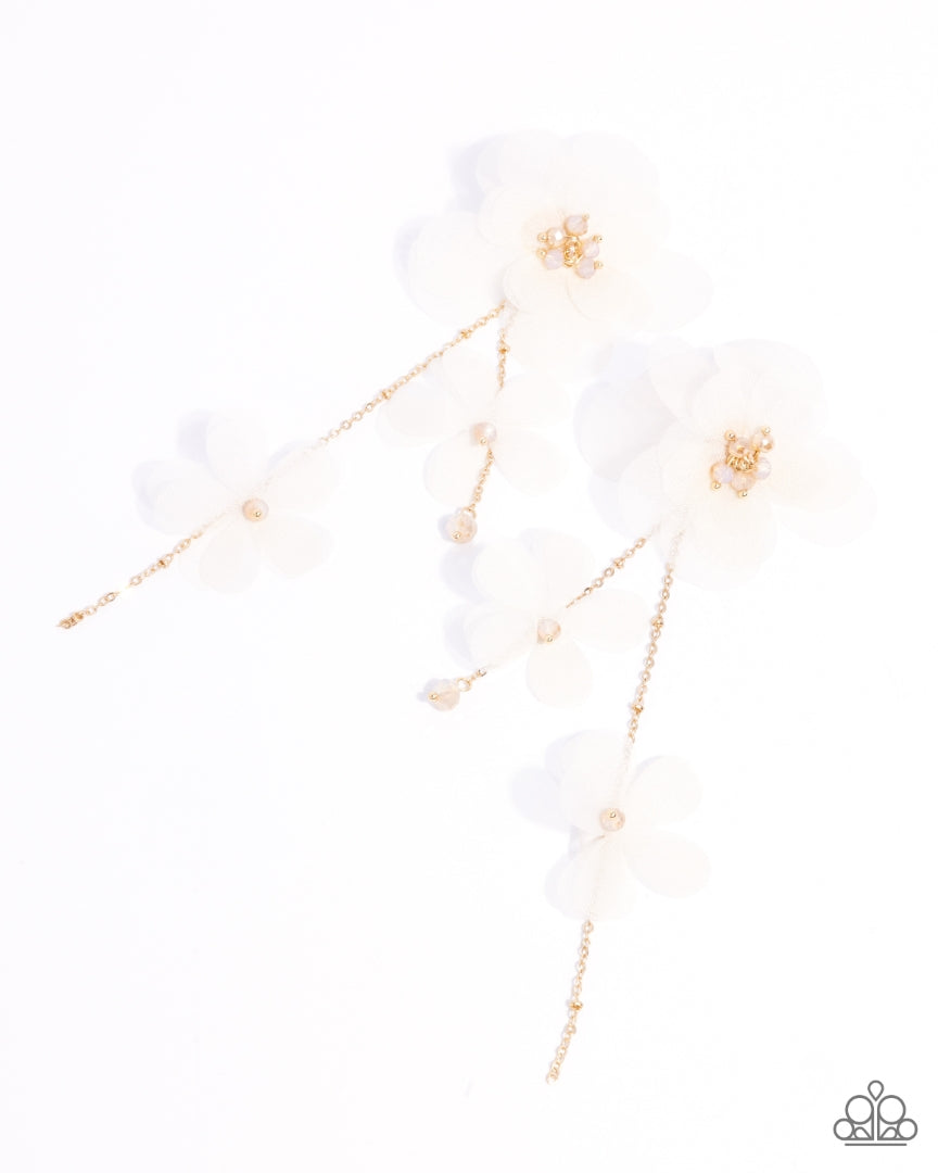 A cluster of UV-dusted opalescent beads dot the centers of three-dimensional ivory chiffon flowers that cascade below the ear and trickle from dainty gold chains creating a classical-inspired display. Earring attaches to a standard post fitting.