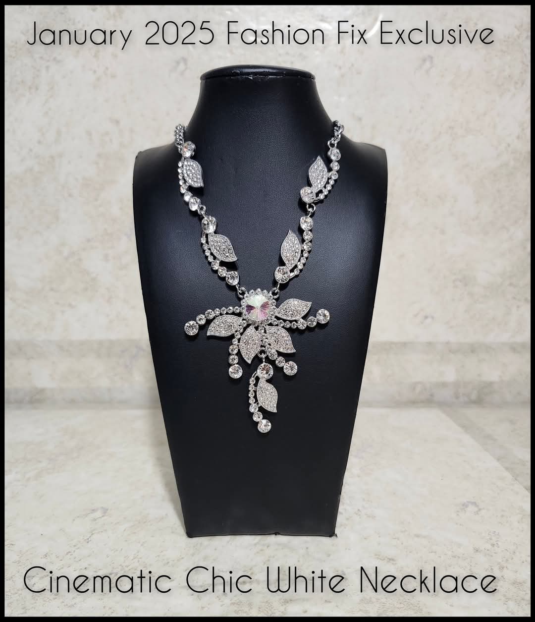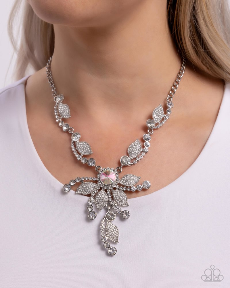 An oversized iridescent rhinestone sits at the center of glittering silver petals, creating a brilliant floral-inspired pendant. Dainty rhinestones and textured silver leaves line the silver chain, adding extra sparkle to the design. Features an adjustable clasp closure. Sold as one individual necklace. Includes one pair of matching earrings