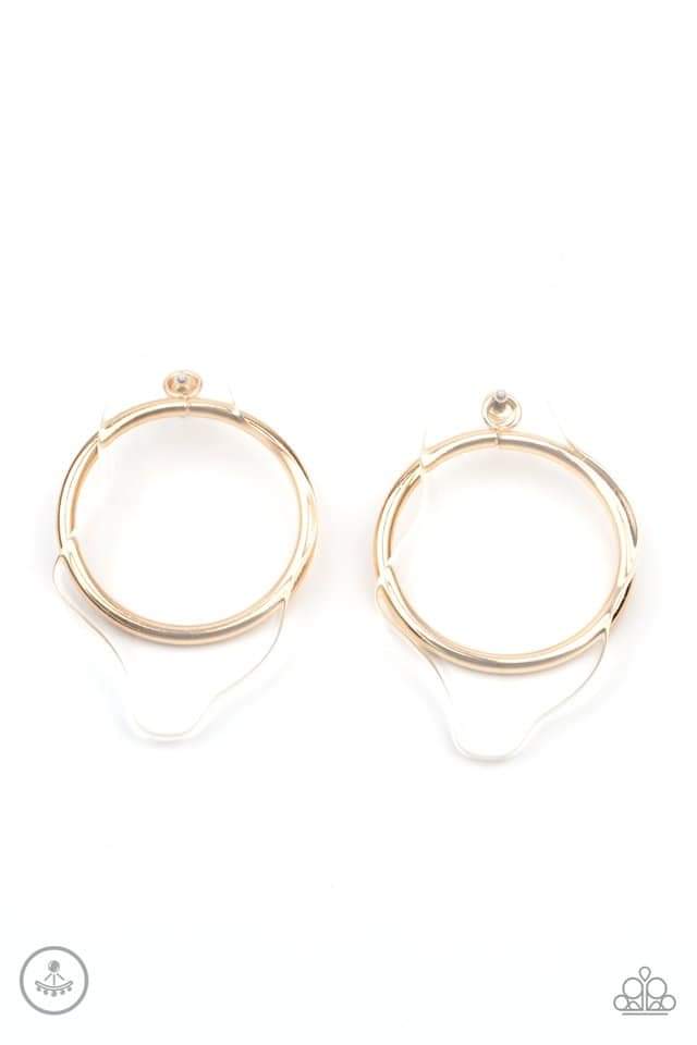 An asymmetrical piece of clear acrylic overlaps a glistening gold hoop, creating a bold display. Earring attaches to a standard post fitting.