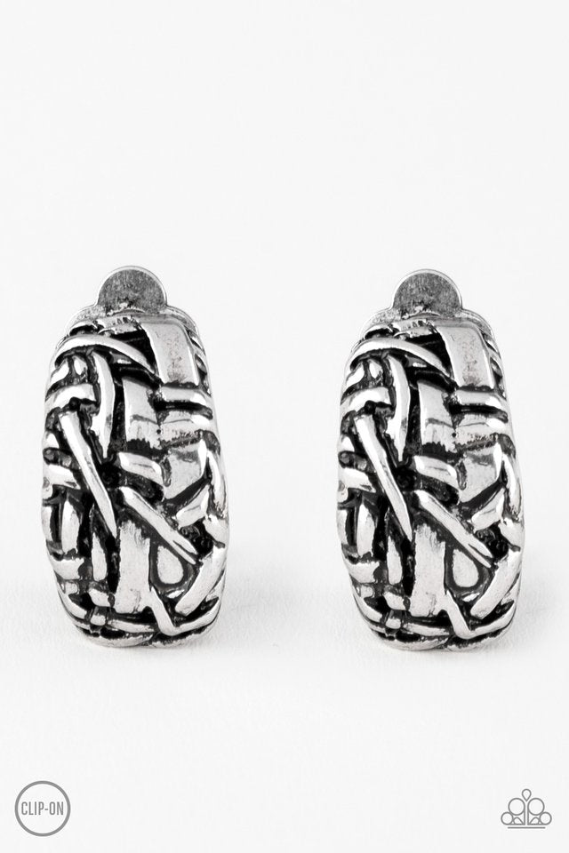 Brushed in an antiqued shimmer, scraps of silver collide into a tactile frame for an edgy urban look. Earring attaches to a standard clip-on fitting.
