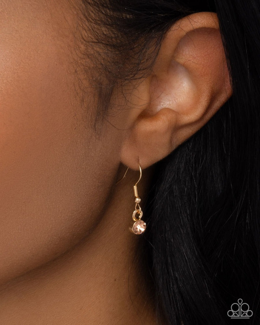 Varying sizes of connected gold circles swing from a lengthened gold snake chain from a gold bail clasp. A soft peach rhinestone is embellished atop the first smaller circle while a defaced green rounded square gem is set along the center of the larger gold hoop, for a dazzling, genteel approach. Features an adjustable clasp closure.