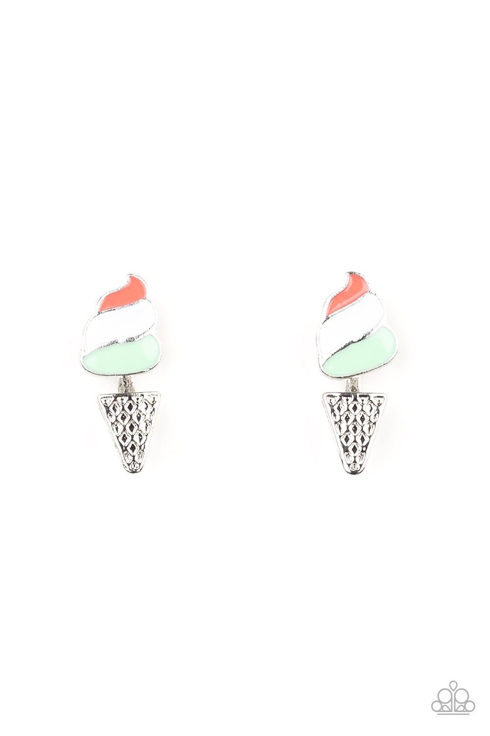 Double-sided post earrings in assorted colors and shapes to be retailed at $1 per pair. The ice cream swirls vary in shades of red, white, green, blue, purple, and yellow. Earrings attach to standard post fittings.