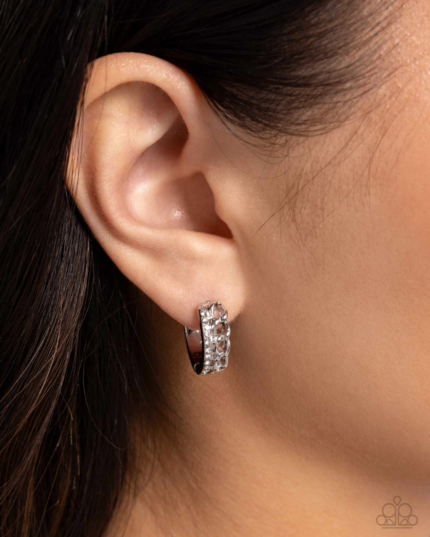 Embellished in white rhinestones a sleek silver bar joins a strand of silver chain coalescing into one singular glittery hoop along the ear. Earring attaches to a standard hinge closure fitting. Hoop measures approximately 3/4" in diameter.