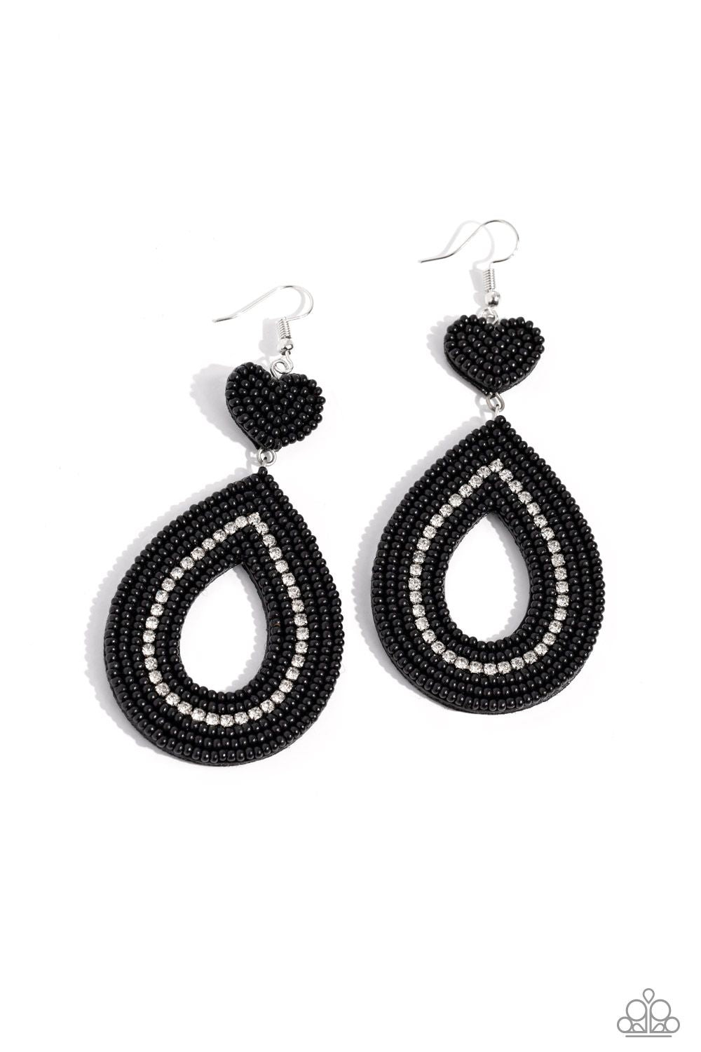 Featuring white rhinestone accents, black seed beads adorn the surface of a teardrop frame that swings from the bottom of a black seed bead heart, creating a colorful lure. Earring attaches to a standard fishhook fitting.