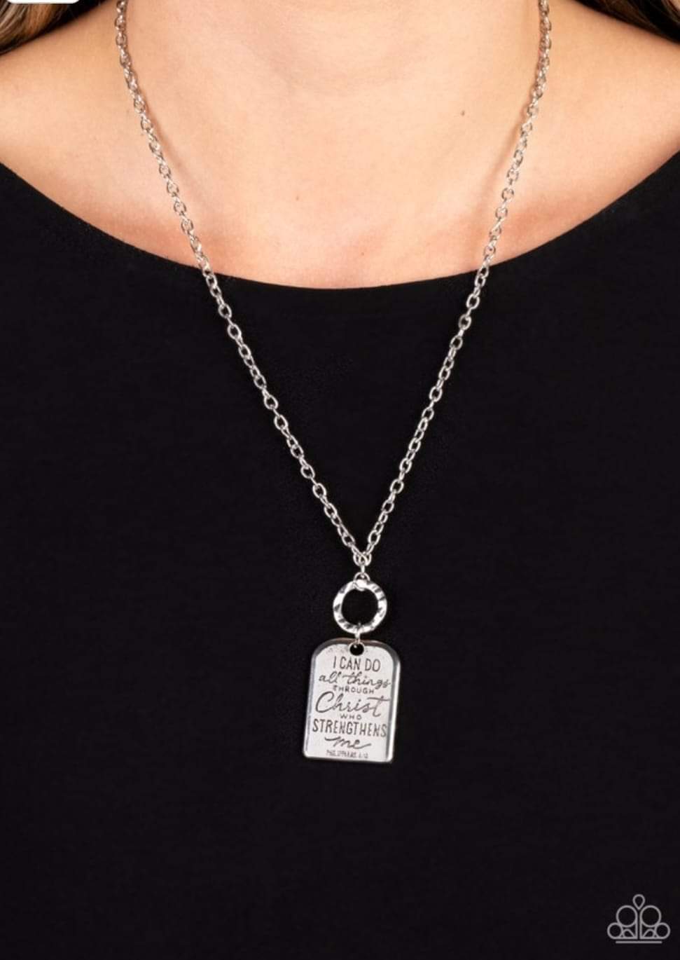Dangling from a simple silver chain, a hammered silver hoop boosts a rounded rectangular plate. Lightly hammered in gritty detail, the silver pendant is stamped with the popular phrase "I can do all things through Christ who strengthens me" with the scripture reference "Philippians 4:13" listed below it in a daintier font for a hopeful finish. Features an adjustable clasp closure.