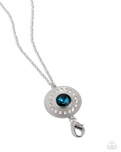 Swinging from the bottom of an elongated silver chain, a dramatic blue gem is pressed into the center of an oversized silver frame, creating a bold pendant. White gems encircle the large blue gem for additional eye-catching radiance. A lobster clasp hangs from the bottom of the design to allow a name badge or other item to be attached. Features an adjustable clasp closure.