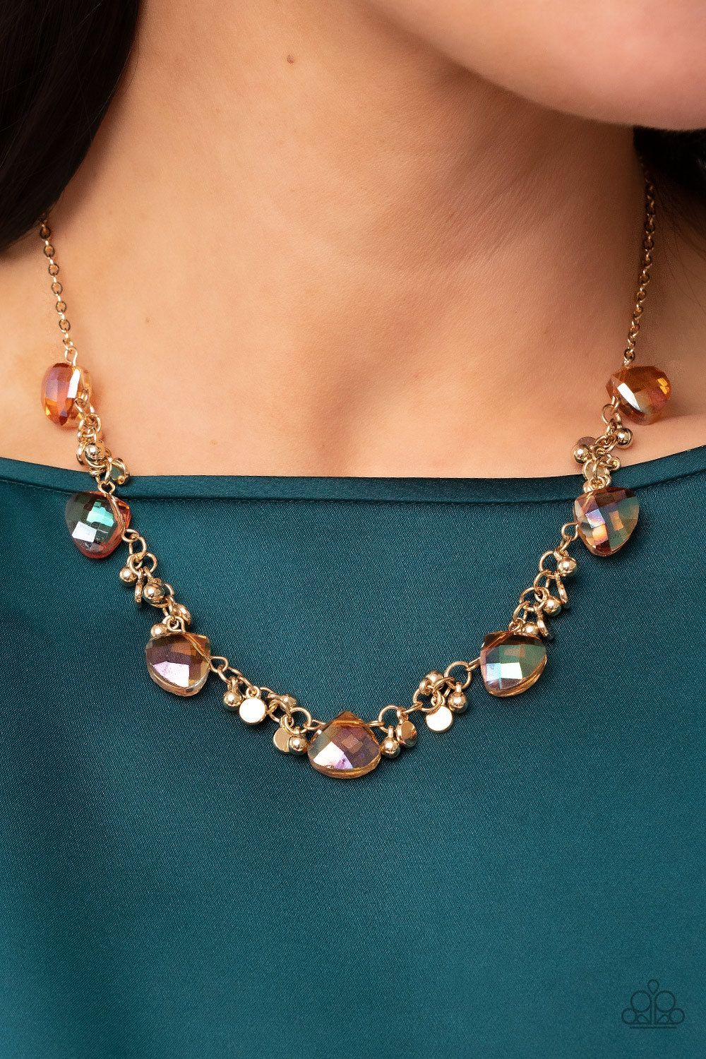 Dainty clusters of gold beads and gold discs connect with iridescent gold gems below the collar, resulting in a stellar fringe. Features an adjustable clasp closure.