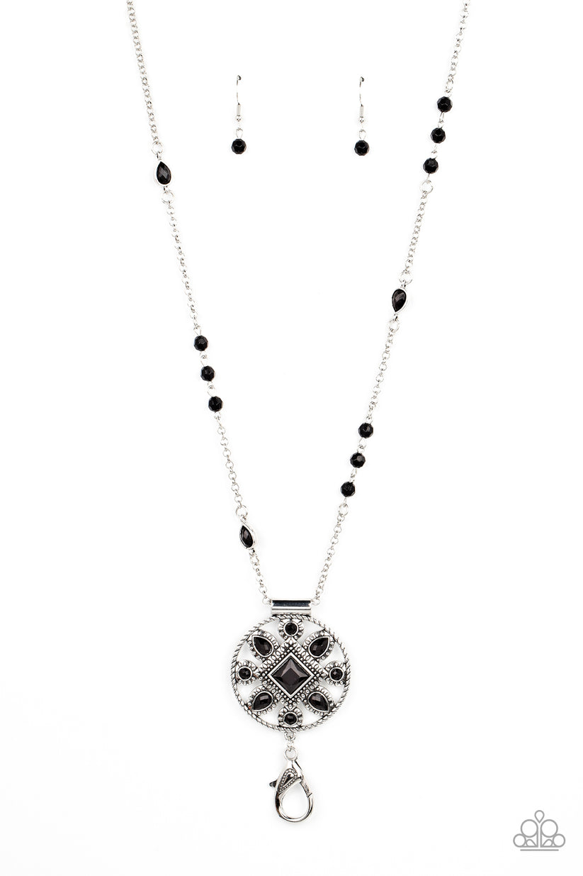 A square black bead is pressed into the silver studded center of a textured silver hoop radiating with round and teardrop black beads. The decorative medallion swings from the bottom of a beaded silver chain, creating a tribal inspired display. A lobster clasp hangs from the bottom of the design to allow a name badge or other item to be attached. Features an adjustable clasp closure.
