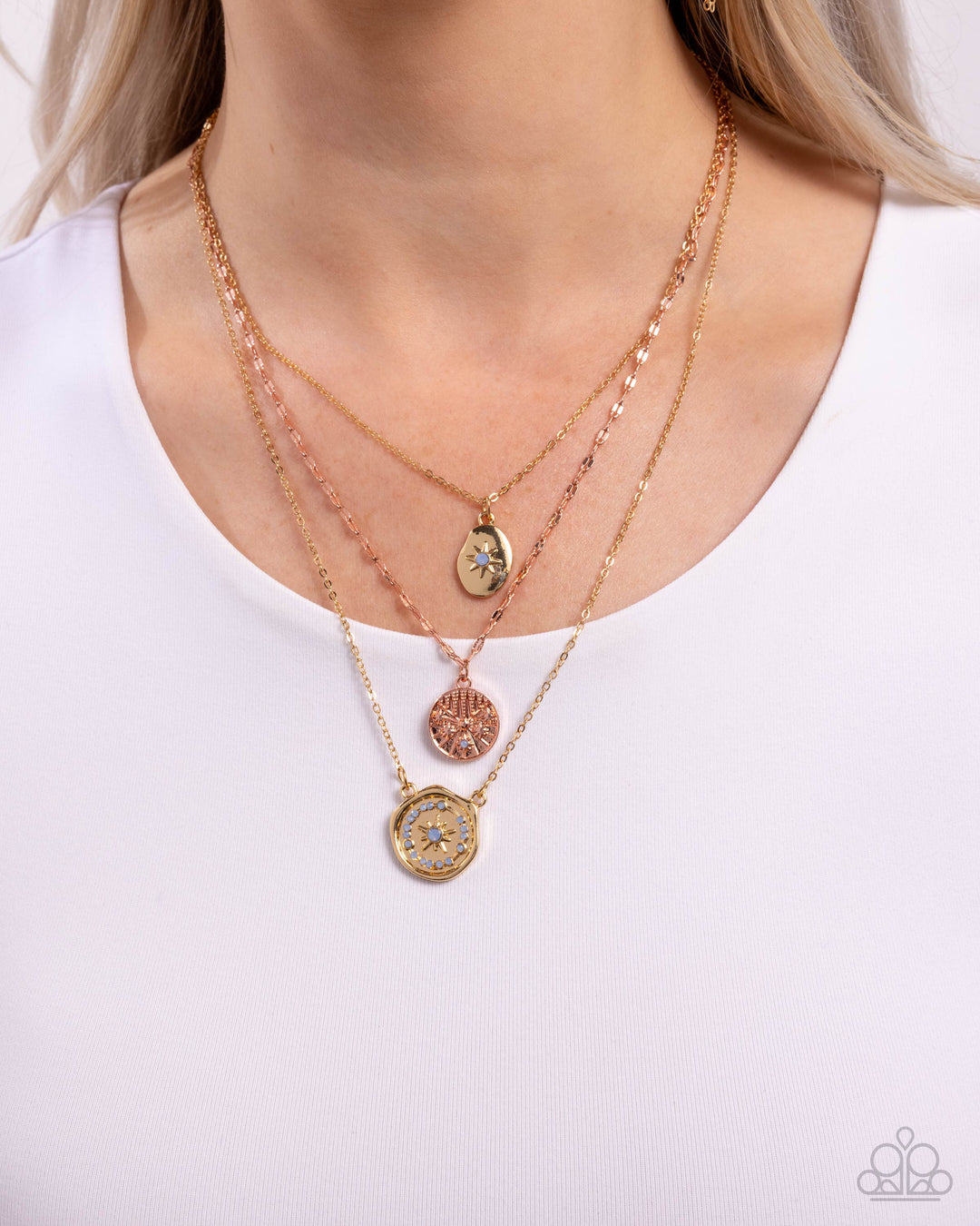 Infused with three stellar pendants, three antiqued gold and shiny copper chains layer across the chest. An abstract gold pendant, stamped with an opalescent star swings from the uppermost chain above a textured star and studded shiny copper stamped disc. A row of opalescent rhinestones encircles an opalescent rhinestone center atop a layered antiqued gold abstract pendant from the lowermost chain for a wanderlust vibe. Sold as one individual necklace. Includes one pair of matching earrings