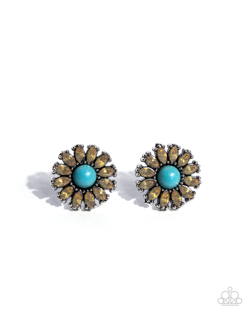 Featuring an opalescent shimmer, faceted yellow marquise-cut petals in pronged-silver fittings fan out from a turquoise stone center, creating a stunning sunflower-inspired display. Earring attaches to a standard post fitting. As the stone elements in this piece are natural, some color variation is normal.