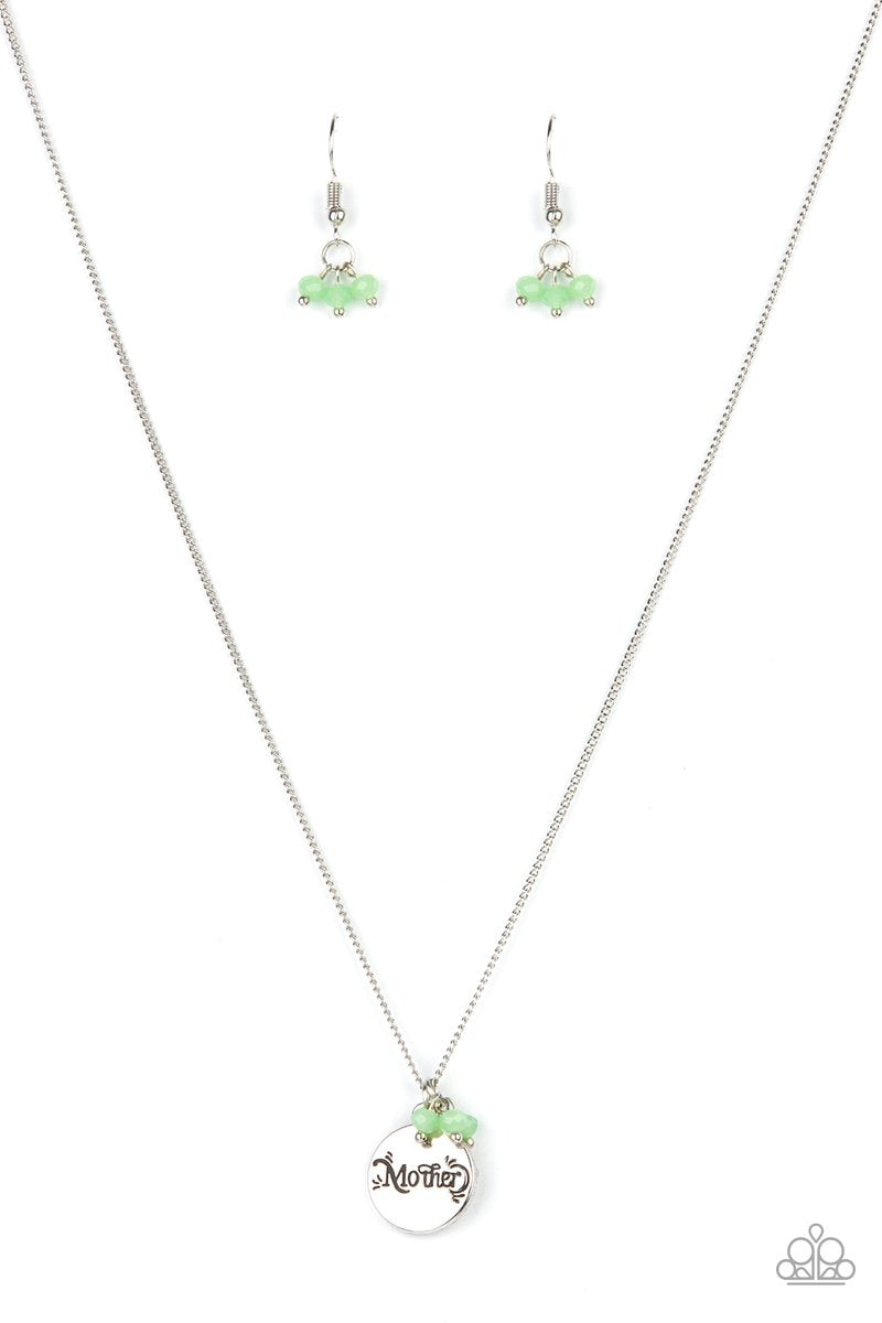 A dainty cluster of opaque Green Ash beads delicately joins a shiny silver disc stamped in the word, "Mother," along a classic silver chain, creating a whimsical pendant below the collar. Features an adjustable clasp closure.