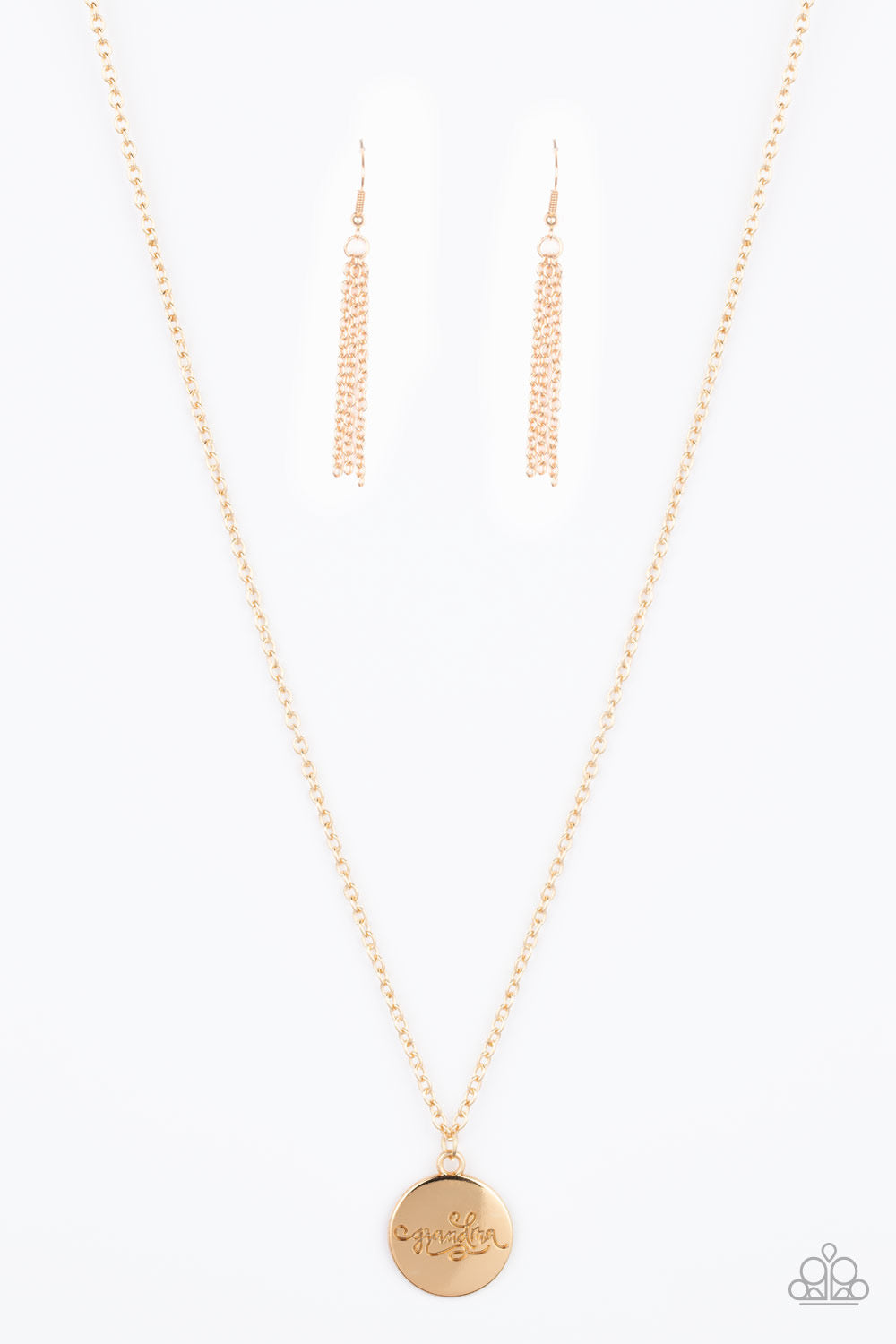 Stamped in the word, "grandma," in whimsical script, a dainty gold disc swings below the collar for a classic look. Features an adjustable clasp closure.